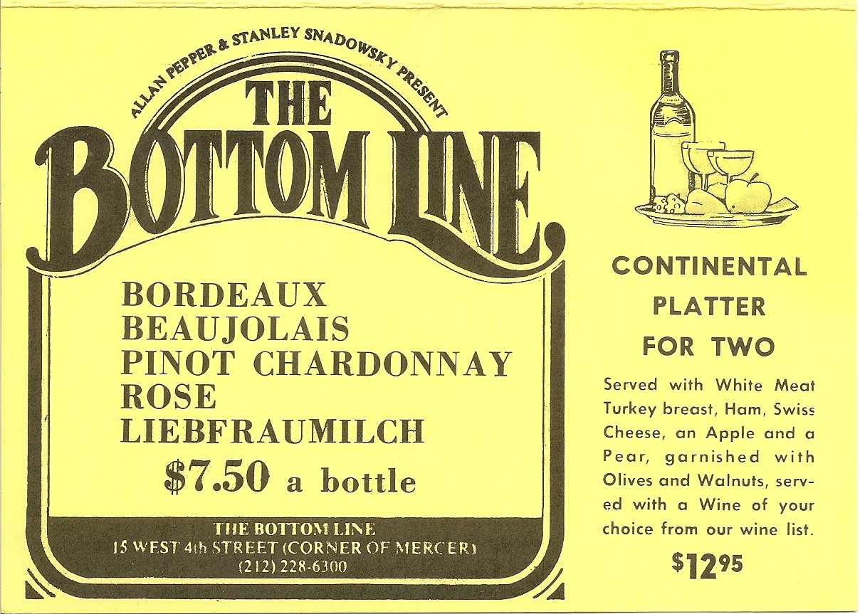 thebottomline logoThe Bottom Line was open from 1972 through 2004. During the late 70’s heyday of the record business, it was the industry’s premier showcase venue, launching many new artists into the spotlight. Seating about 300, the Bottom Line offered brilliant sound, great food, and an excellent view from just about every seat. It was a place for the industry and the famous (who would be spotted there almost every night), as well as for the serious music fan.