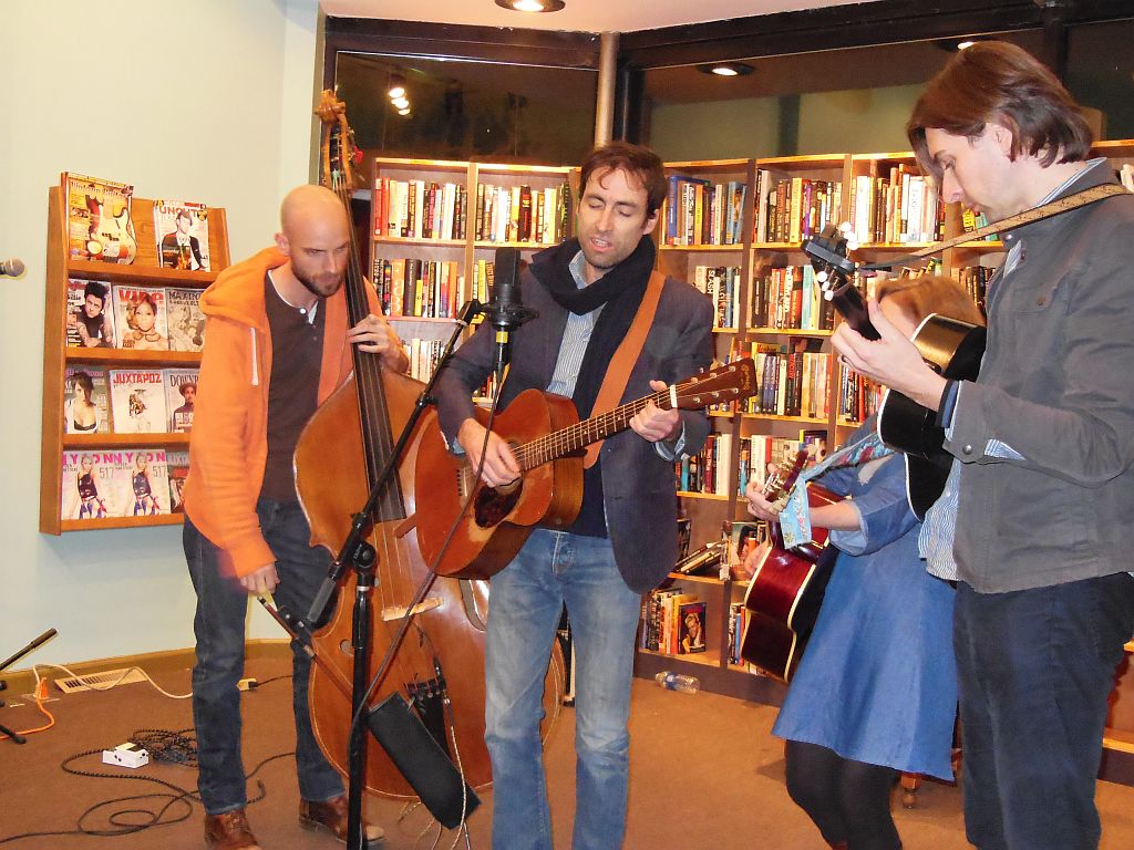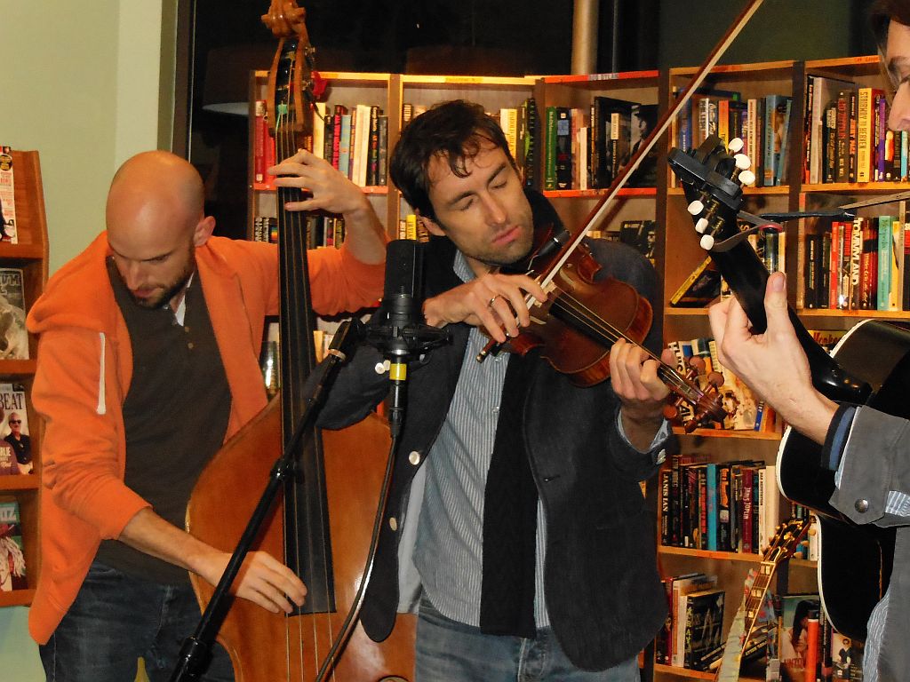 Offering a song selection spanning his career, Andrew commented on how he has reworked the lyrics to some of his older songs. And, lyrics are precisely where my problem with Bird lies–I love the music but I don’t like the songs. I’m forever a sucker for words I can follow and make sense of. As for adjectives to describe Bird’s songs–quirky, strange and perhaps pretentious are the ones that come to mind. While I stood listening at Grimey’s, I could never jump on board with his songs and after hearing a few lines of each, I felt repeatedly lost. But I felt like I was alone in this sentiment since Bird had this crowd of young and exuberant fans totally in his command—even though when my eyes scanned the audience, I couldn’t find a single person who was singing along with him. I guess many younger fans today look at songs much differently than I do.