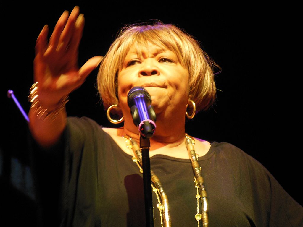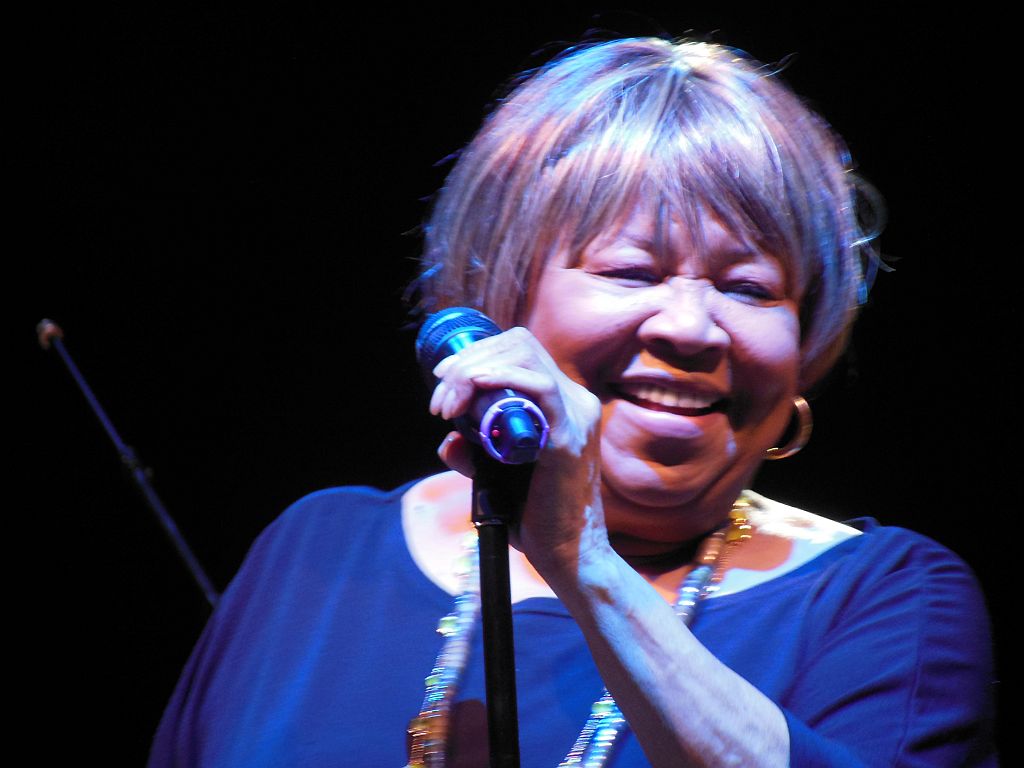 I learned of an unannounced switcheroo from a glance at the soundboard time schedule. Staples, the billed headliner, would precede The Blind Boys of Alabama and play only a one-hour set. After a few rather pedestrian songs by a local bar band, Staples took to the stage using a cane to support her new knee. Her band was a basic but tasty trio of guitar, bass, and drums supported by three back-up singers, including her younger sister Yvonne.