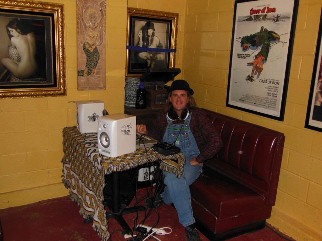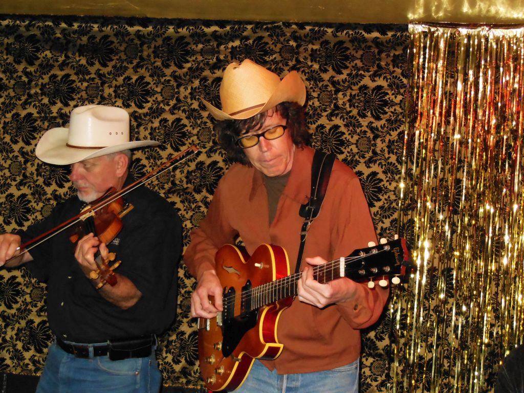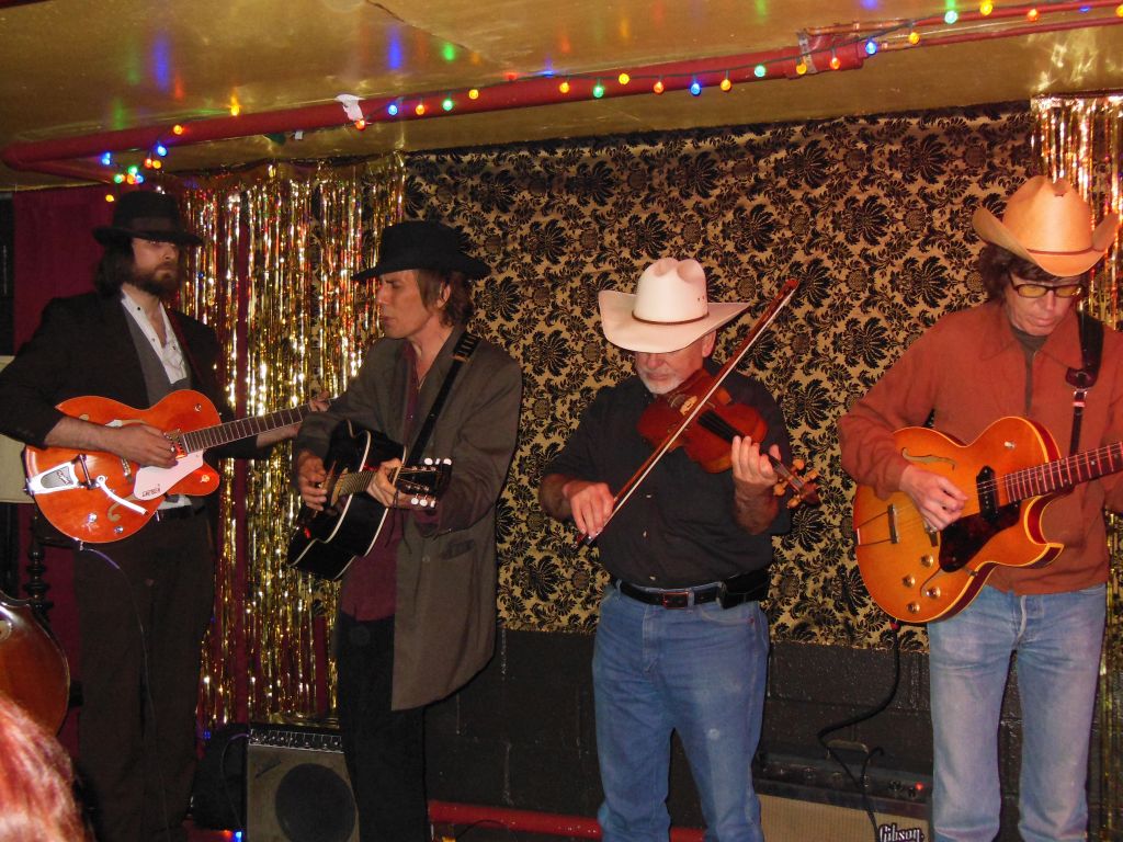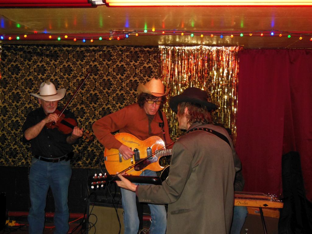 As show time approached just after 9:00, we sat ourselves in back of the two rows of old wooden theater seats in the small adjoining music room. Off in the corner, with his back to the crowd of now about 40, Garing and the band did a brief warm-up to themselves. The room was dimly lit with exotic red florescent lighting although two of the four bulbs were not working. The stage was nothing more than a section on the floor marked off with tape. An old rug hung on the wall accessorized by dangling glitter streamers. The only amplification tonight would be two small vintage amps—one for a much-traveled pedal steel and one for the guitar of Nashville’s best, Kenny Vaughan, who walked in just seconds before show time.