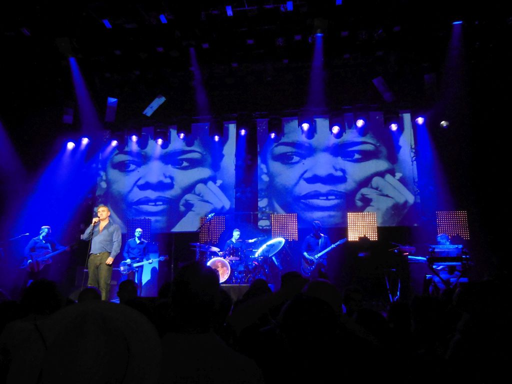 He sang against a backdrop of two large photos of American author and poet Maya Angelou who had died earlier that day. At one time he asked why she couldn’t have been president of the United States. That query led to the first of a few “what does the audience think” moments where he handed the mike to let some folks down in front say a few words.