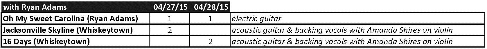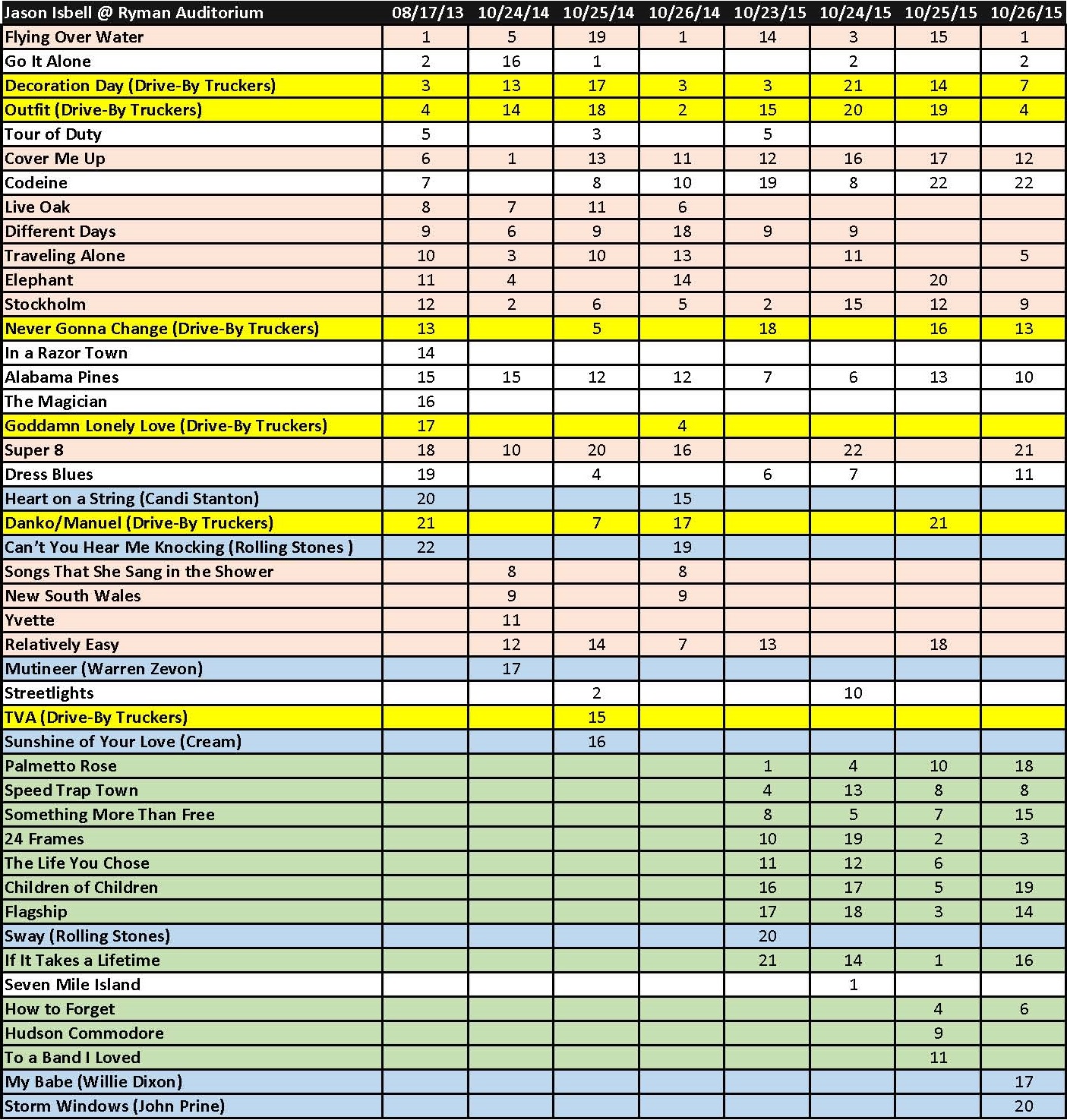 Next are the songs he played. The color coding sorts them into covers, Drive-By Truckers songs and those from the Southeastern and Something More Than Free records. In case you don’t notice, 2014 included an album night for Southeastern and 2015 had one for Something More Than Free.